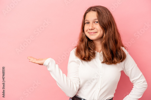 Little caucasian girl isolated on pink background showing a copy space on a palm and holding another hand on waist.