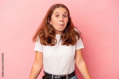 Little caucasian girl isolated on pink background shrugs shoulders and open eyes confused.