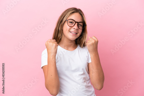 Little caucasian girl isolated on pink background With glasses and celebrating a victory