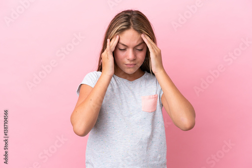 Little caucasian girl isolated on pink background with headache