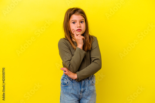 Little caucasian girl isolated on yellow background having some great idea, concept of creativity.