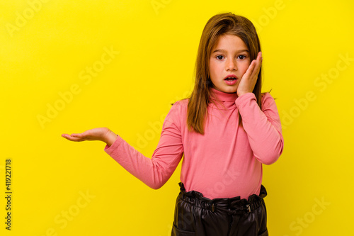 Little caucasian girl isolated on yellow background impressed holding copy space on palm.