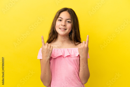 Little caucasian girl isolated on yellow background pointing up a great idea
