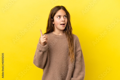 Little caucasian girl isolated on yellow background thinking an idea pointing the finger up
