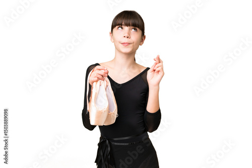 Little caucasian girl practicing ballet over isolated background with fingers crossing and wishing the best