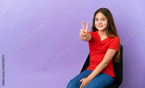 Little caucasian girl sitting on a chair isolated on purple background smiling and showing victory sign