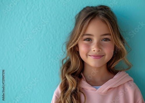 little caucasian girl with colorful sweatshirt in professional colorful photo studio background