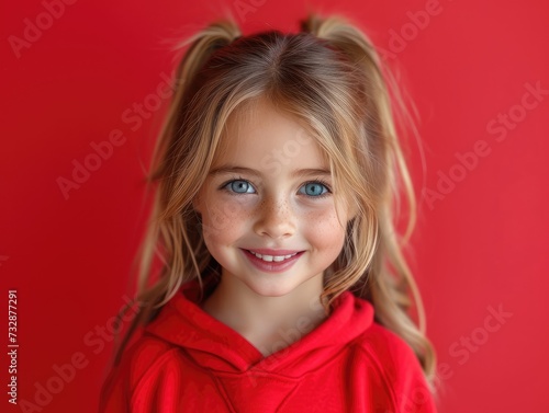 little caucasian girl with colorful sweatshirt in professional colorful photo studio background