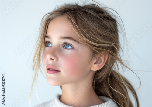 little caucasian girl with colorful sweatshirt in professional colorful photo studio background