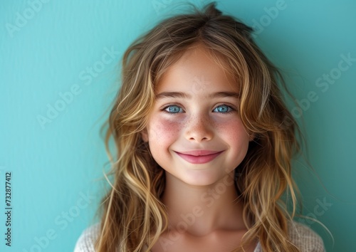 little caucasian girl with colorful sweatshirt in professional colorful photo studio background