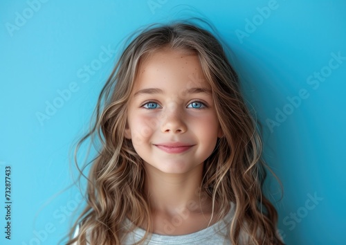little caucasian girl with colorful sweatshirt in professional colorful photo studio background