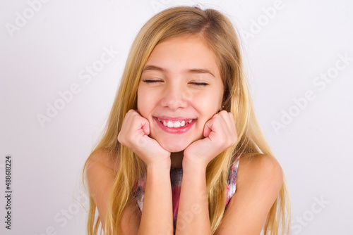 little caucasian kid girl wearing sport clothing over white background grins joyfully, imagines something pleasant, copy space. Pleasant emotions concept.