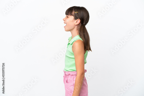 Little caucasian kid isolated on white background laughing in lateral position