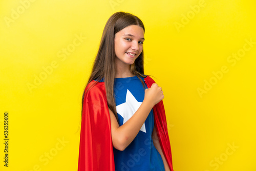 Little caucasian superhero girl isolated on yellow background celebrating a victory