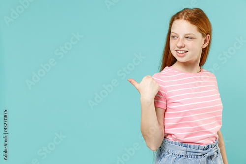 Little cool redhead kid girl 12-13 years old in pink striped t-shirt point thumb finger aside on workspace area mock up isolated on pastel blue background studio. Children lifestyle childhood concept.