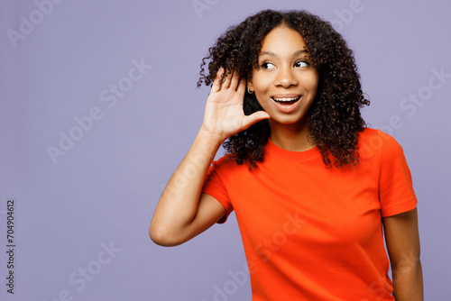 Little curious kid teen girl of African American ethnicity wear orange t-shirt try to hear you overhear listen intently isolated on plain pastel light purple background. Childhood lifestyle concept.
