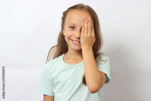 little cute cheerful girl passes an eye test in the office of an ophthalmologist