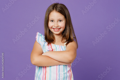 Little fun smiling happy cool kid child girl 6-7 years old wears striped dress hold hands crossed folded isolated on plain pastel light purple background. Mother's Day love family lifestyle concept.