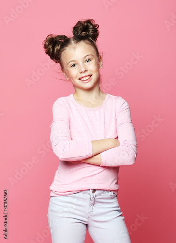 Little girl dressed casually posing on pink background