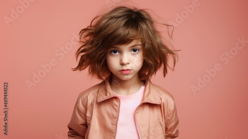 Little girl in a pink jacket. Studio portrait on a pink background. Generative AI