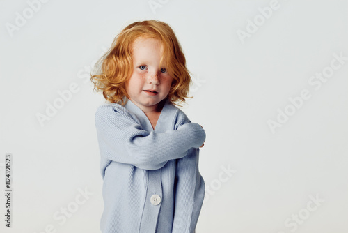 Little girl in blue sweater standing crossed arms on white background fashion portrait beauty concept