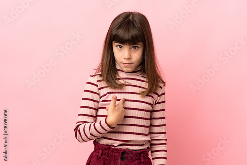 Little girl isolated on pink background pointing to oneself