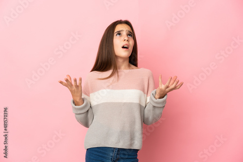 Little girl isolated on pink background stressed overwhelmed