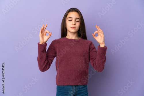 Little girl isolated on purple background in zen pose