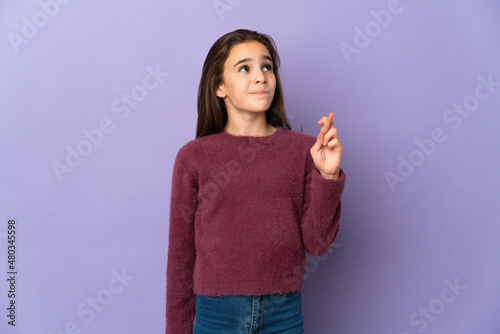 Little girl isolated on purple background with fingers crossing and wishing the best