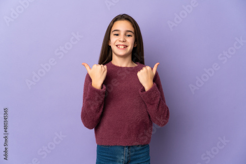Little girl isolated on purple background with thumbs up gesture and smiling