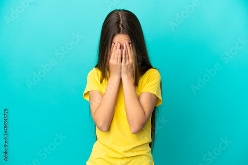 Little girl over isolated blue background with tired and sick expression