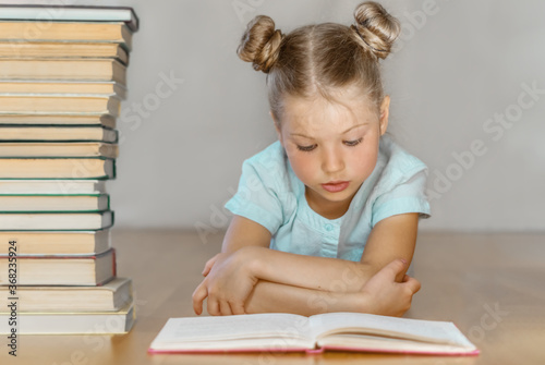 Little girl schoolgirl lies on the floor, smiling and reads a book. Near a stack of books on a blurry light background. Back to school concept. Copy space. Free time for the child