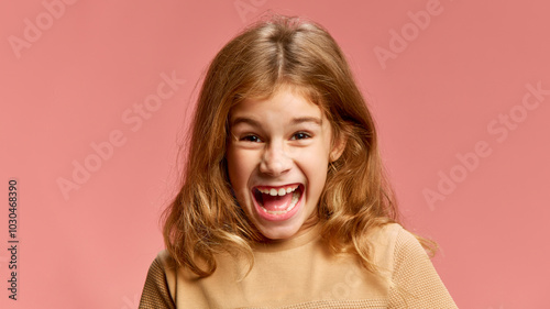 Little girl screaming, face lights up with pure joy, mouth wide open in excitement against soft pink studio background. Concept of facial-expressions, positive and negative emotions. Ad