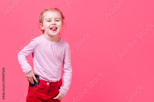 Little girl shows tongue and puts her cellphone in pocket