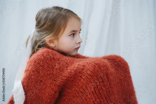 Little girl sitting with her knees engulfed in a orange knitted sweater at home