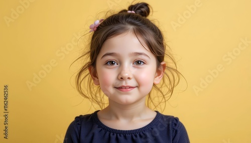 Little girl with a playful smile and messy bun hairdo against a yellow background