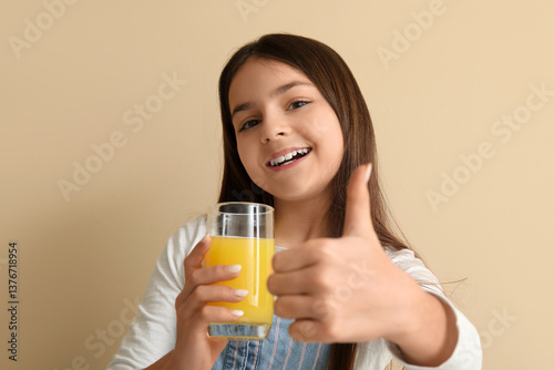 Little girl with glass of orange juice showing thumb-up on beige background, closeup
