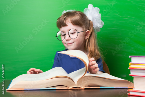 Little girl with white bows watching book