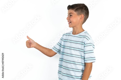 Little hispanic boy wearing striped T-shirt Looking proud, smiling doing thumbs up gesture to the side. Good job!
