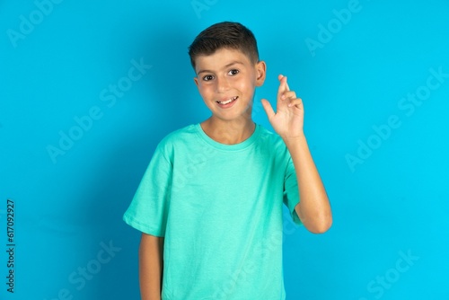 Little hispanic boy wearing green T-shirt pointing up with fingers number ten in Chinese sign language Shi