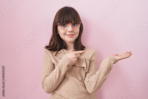Little hispanic girl wearing glasses amazed and smiling to the camera while presenting with hand and pointing with finger.