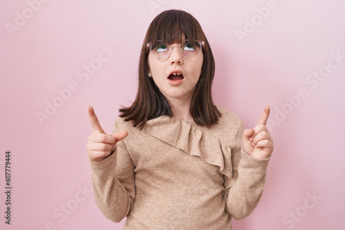 Little hispanic girl wearing glasses amazed and surprised looking up and pointing with fingers and raised arms.