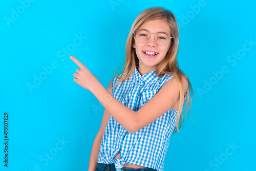 little kid girl with glasses wearing plaid shirt over blue background pointing away and smiling to you. Look over there!