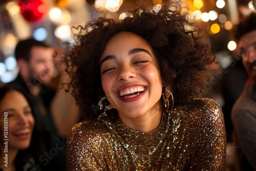 Lively gathering with joyful woman in sparkling outfit surrounded by friends celebrating at a festive event