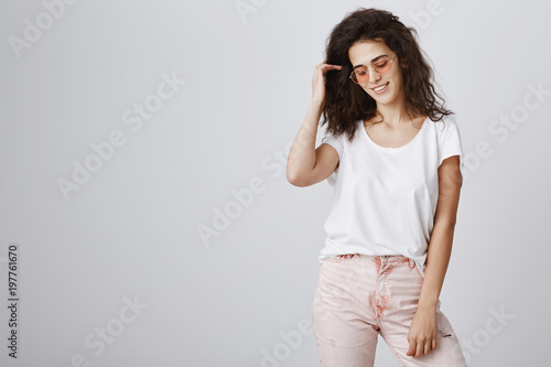 Living fashionable and modern life. Portrait of stylish urban curly-haired woman in trendy sunglasses and pink trousers looking down and smiling broadly while posing during advertising campaign