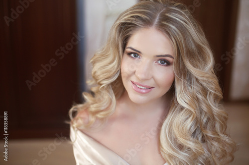 Long curly hair. Beautiful blond happy smiling bride girl lookin