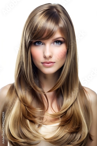 Long Hair Haircut with Highlights for Round Face – Isolated on White Background