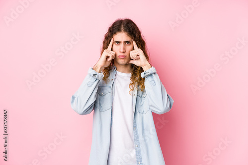 Long hair man posing isolated focused on a task, keeping forefingers pointing head.