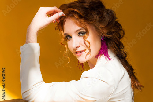 Long purple ostrich feather earrings on a red-haired girl in a white jacket. Girl posing on orange background in sunny weather