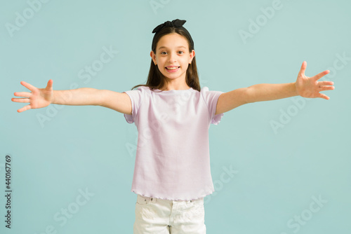 Long time no see! Little girl holding her arms for a hug